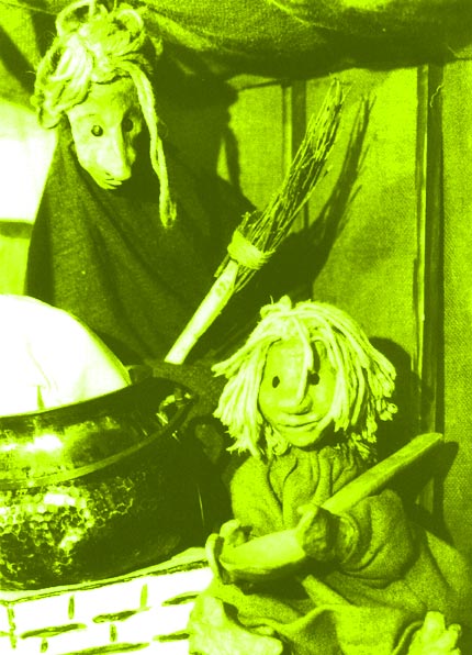 Entzückendes Stockpuppenspiel nach dem Märchen der Brüder Grimm Zuerst noch in der rundlichen Bühne verborgen , entwickelt sich das Stockpuppenspiel in Dorf und Wald für eine Spielerin, für neun Figuren, für einen Topf und für fast einen Kubikmeter Brei zu einem üppigen Bild. |