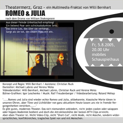 Aus dieser Feinde Unheilsschoß empfängt Ein liebend Paar sein schicksalsdunkles Sein; Das bittre Los, das über sie verhängt, Sargt als sie tot, der Eltern Hass mit ein. ".....Romeo und Julia sind wieder echte Romeo und Julia, altbekannte, klassische Worte tönen in unseren Ohren, aber Töne und Lichtbilder von ganz aktuellem Heute lassen uns nie in fremde Vergangenheiten versinken......"