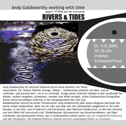 Einer der bekanntesten zeitgenössischen Künstler ist der Schotte Andy Goldsworthy mit seinen faszinierenden Arbeiten aus Naturmaterialien. Steine, Blätter, Zweige, Eis und Blüten werden in streng geometrischen und überaschenden Gebilden den natürlichen Wettereinflüssen und der Zeit ausgesetzt: Ein Film über das Unvorhersehbare, das Üeberraschende und Vergängliche. |