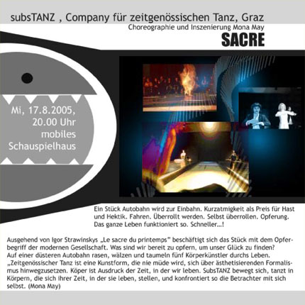 Ein Stück Autobahn wird zur Einbahn. Kurzatmigkeit als Preis für Hast und Hektik. Fahren. Überrollt werden. Selbst überrollen. Opferung. Das ganze Leben funktioniert so. Schneller…! Ausgehend von Igor Strawinskys Le sacre du printemps“ beschäftigt sich das Stück mit dem Opferbegriff der modernen Gesellschaft. Was sind wir bereit zu opfern, um unser Glück zu finden? Auf einer düsteren Autobahn rasen, wälzen und taumeln fünf Körperkünstler durchs Leben. Zeitgenössischer Tanz ist eine Kunstform, die nie müde wird, sich über ästhetisierenden Formalismus hinwegzusetzen. Köper ist Ausdruck der Zeit, in der wir leben. SubsTANZ bewegt sich, tanzt in Körpern, die sich ihrer Zeit, in der sie leben, stellen, und konfrontiert so die Betrachter mit sich selbst. (Mona May) |
