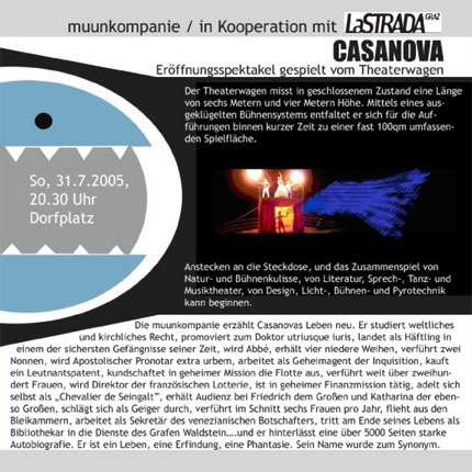 Bei der Auswahl der Themen und Vorlagen für ihr Theater greift die muunkompanie auf die "Hohe Literatur" als Ressource zurück. Geschichten, Legenden, Mythen: Casanova…. Er studiert weltliches und kirchliches Recht, promoviert zum Doktor utriusque iuris, landet als häftling in einem der sichersten Gefängnisse seiner Zeit, wird Abbé, erhält vier niedere Weihen, verführt zwei Nonnen, wird Apostolischer Pronotar extra urbem, arbeitet als Geheimagent der Inquisition, kauft ein Leutnantspatent, kundschaftet in geheimer Mission die Flotte aus, verführt weit über zweihundert Frauen, wird Direktor der französischen Lotterie, ist in geheimer Finanzmission tätig, adelt sich selbst als Chevalier de Seingalt“, erhält Audienz bei Friedrich dem Großen und Katharina der Großen, schlägt sich als Geiger durch, verführt im Schnitt sechs Frauen pro Jahr, flieht aus den Bleikammern, arbeitet als Sekretär des venezianischen Botschafters, tritt am Ende seines Lebens als Bibliothekar in die Dienste des Grafen Waldstein….und er hinterlässt eine über 5000 Seiten starke Autobiografie. Er ist ein Leben, eine Erfindung, eine Phantasie. Sein Name wurde zum Synonym. Die Muunkompanie erzählt sein Leben neu. Dafür wurde ein Theaterwagen gebaut, der im geschlossenen Zustand eine Länge von sechs Metern und ist vier Meter Höhe misst. Mittels eines ausgeklügelten Bühnensystems entfaltet er sich für die Aufführungen binnen kurzer Zeit zu einer fast 100qm umfassenden Spielfläche. In Kooperation mit LaStrada, Graz |