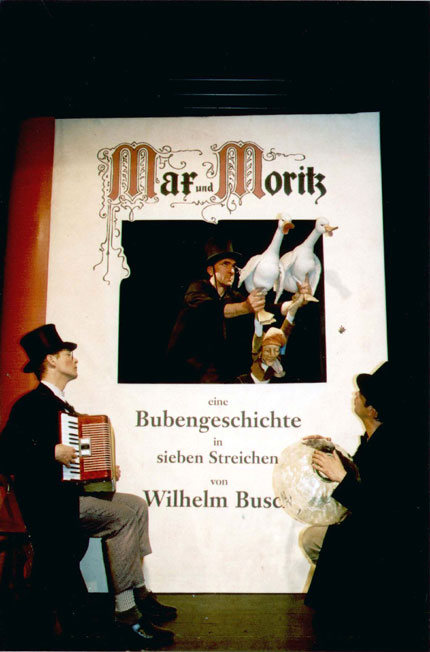 Theater SALZ & PFEFFER (Deutschland) Max und Moritz“ für böse Herren, Damen, Buben und Mädel mit Lehranstalts-Erfahrung Spielerisch überschreitet dieses Ensemble die Grenzen zwischen Puppenspiel und Schauspiel. Bestens aufeinander abgestimmt bescheren Salz und Pfeffer“ den Zuschauern eine schwarzhumorig interpretierte Lausbubengeschichte. Sarkastischer Humor, treffende Beobachtungen, Anarchie und Hintersinn. |