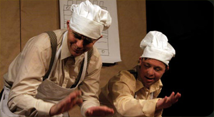 Tarte au Chocolat Eine Schokotorte ist rund, schokoladig und gut. Aber was passiert, wenn bei Meisterkoch Jean-Paul und seinem Neffen Erwin das Ei nicht so will, wie die Köche es wollen? Wenn der Teig davon rennt und der Zucker spinnt? Zwei Köche auf der Suche nach dem richtigen Rezept backen im Duett und liefern ein durch und durch komisches Slapstick-Stück. Der ordnungsliebende Clown Jean-Paul, der sich seit Jahren in der weiten Welt des Zirkus (Roncalli, Tigerpalast etc.) bewegt, trifft auf seinen charmanten Neffen Erwin. Dieser ist schon in zahlreichen KumEina-Produktionen erfolgreich auf der Bühne gestanden. SchauSpiel: Erwin Slepcevic, Jean-Paul Ledun Das Mezzanin Theater erhielt 2005 den Würdigungspreis für Kunst- und Kulturprojekte zur Integration von Menschen mit Behinderung. |