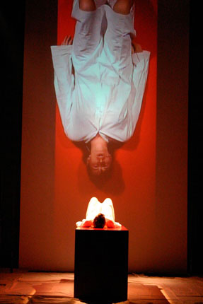 Die katholische Messe ist eigentlich eine überwältigende Show. Während die Gemeinde im poetischen, rhythmischen Gemurmel versinkt, hat der Priester einen Glanzauftritt als Rhetoriker; und alle Handlung strebt dem ultimativen Ritual zu, der Aufbereitung von Brot als Körper und Wein als Blut, der Einverleibung von Körper und Blut letzten Endes. Der neue Text, die Messe für Eine“, hält sich an den Verlauf der katholischen Messe, wortet aber um, schichtet um, reißt auseinander, lässt sich den Herrschaftsdiskurs nicht gefallen und zielt in die Mitte der Dinge.